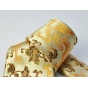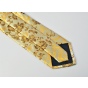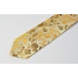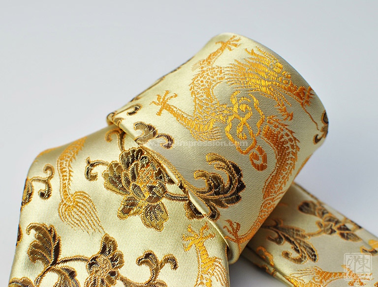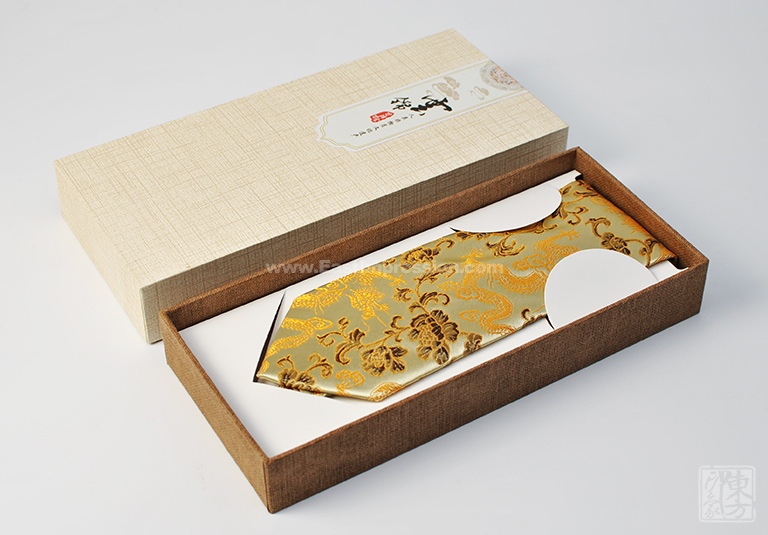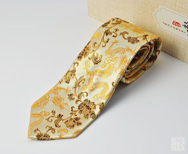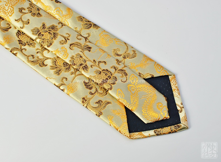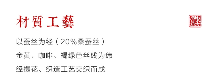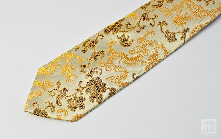 云锦领带以蚕丝为经(20%桑蚕丝),金黄、咖啡、褐绿色丝线为纬,经提花、织造工艺交织而成。表面光亮细腻,质地紧密厚实。图案以金线勾边或金线装饰花纹,晕色和谐,展现了云锦大量用金的显著特色。