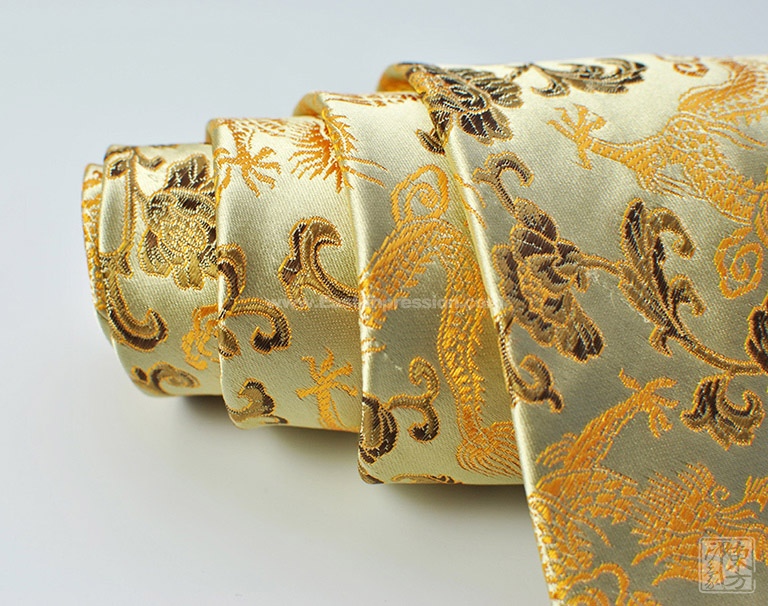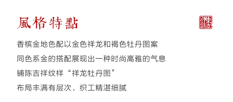香槟金地色配以金色祥龙和褐色牡丹图案,同色系金的搭配展现出一种时尚高雅的气息。铺陈吉祥纹样“祥龙牡丹图”,布局丰满有层次,织工精湛细腻。