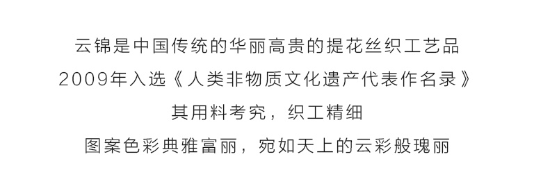 “江南好,机杼夺天工,孔雀妆花云锦烂,冰蚕吐凤雾绡空,新样小团龙。”这是明末诗人吴梅村赞美云锦的诗句(但诗中的“云锦”不是指一块布,它不作名词)。其实,明代时并没有云锦这个词,当时进入皇家的缎子称库锦、库缎和妆花。而云锦一词,来源于清代道光年间的苏州“云锦织所”,最早的文字记载则是出自于民国南京的《工商半月刊》。由于其用料考究,织工精细,图案色彩典雅富丽,宛如天上彩云般的瑰丽,“云锦”一词才开始流传。