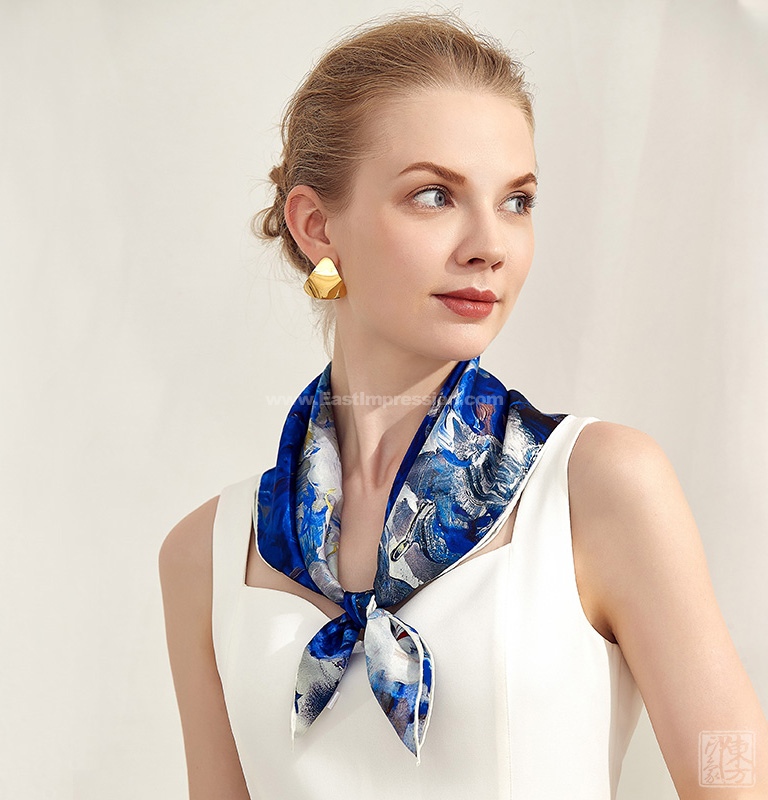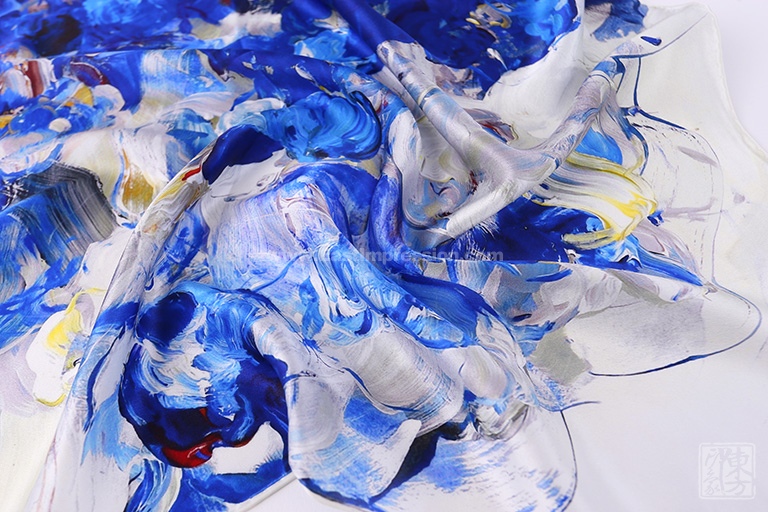丝巾散发着珍珠般柔和的光泽,表面平整光洁,触感细腻丝滑。丝巾图案是加拿大油画家博比•宝格丝的作品,她凭借女性的细腻和敏感,以花卉为表现主题,将抽象与写实融合在一起,用色大胆,笔触快意,给人以强烈的视觉冲击力,自然也是脖颈间靓丽的风景线。