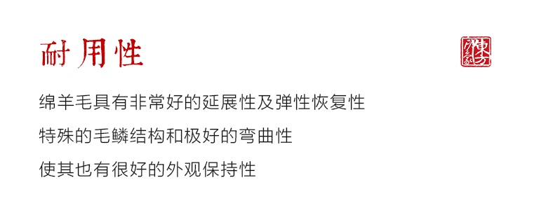 耐用性:绵羊毛具有非常好的延展性及弹性恢复性,特殊的毛鳞结构和极好的弯曲性使其也有很好的外观保持性。