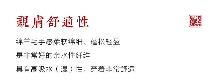 亲肤舒适性:绵羊毛手感柔软绵细、蓬松轻盈,是非常好的亲水性纤维,具有高吸水(湿)性,穿着非常舒适。