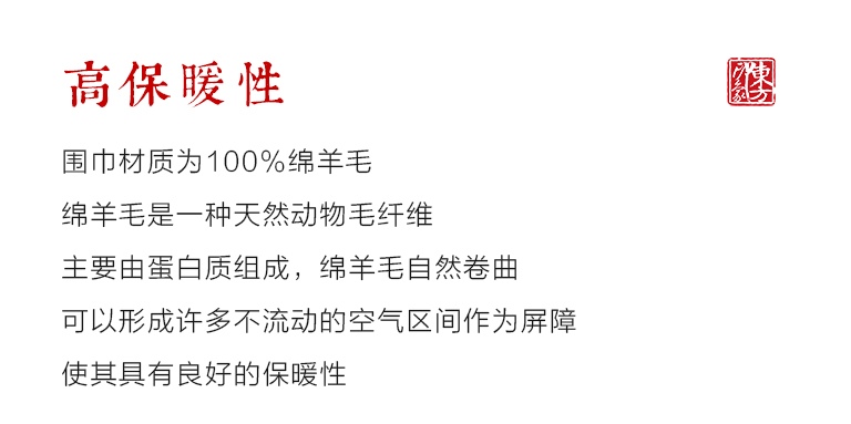 围巾材质为100%绵羊毛。绵羊毛是一种天然动物毛纤维,主要由蛋白质组成,它具有优良的特性。