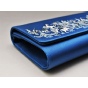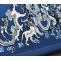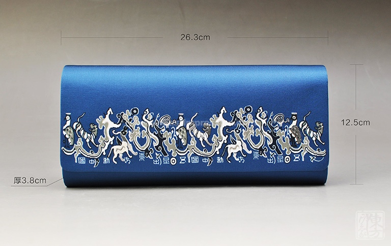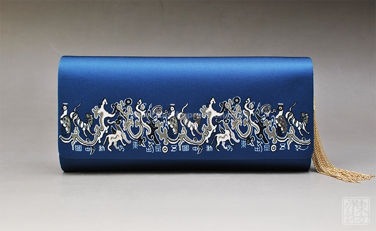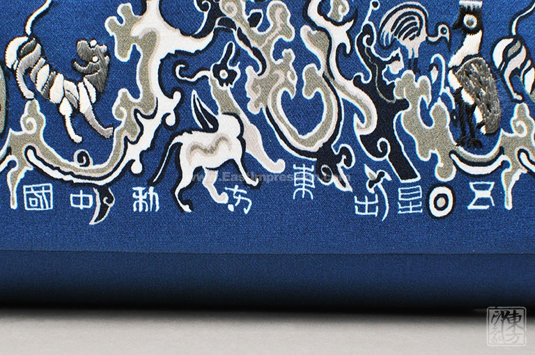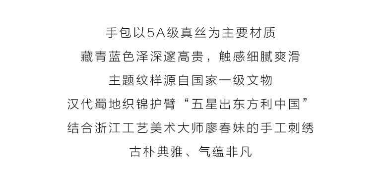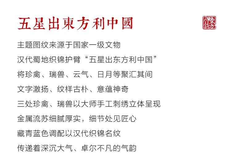 主题图纹来源于国家一级文物汉代蜀地织锦护臂“五星出东方利中国”,将珍禽、瑞兽、云气、日月等聚汇其间,文字激扬、纹样古朴、意蕴神奇。三处珍禽、瑞兽以大师手工刺绣立体呈现,金属流苏细腻厚实,细节处见匠心。藏青蓝色调配以汉代织锦名纹,传递着深沉大气、卓尔不凡的气韵。
