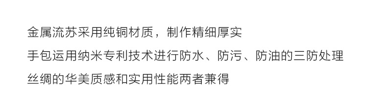 手包运用纳米专利技术进行防水、防污、防油的三防处理,丝绸的华美质感和实用性能两者兼得。