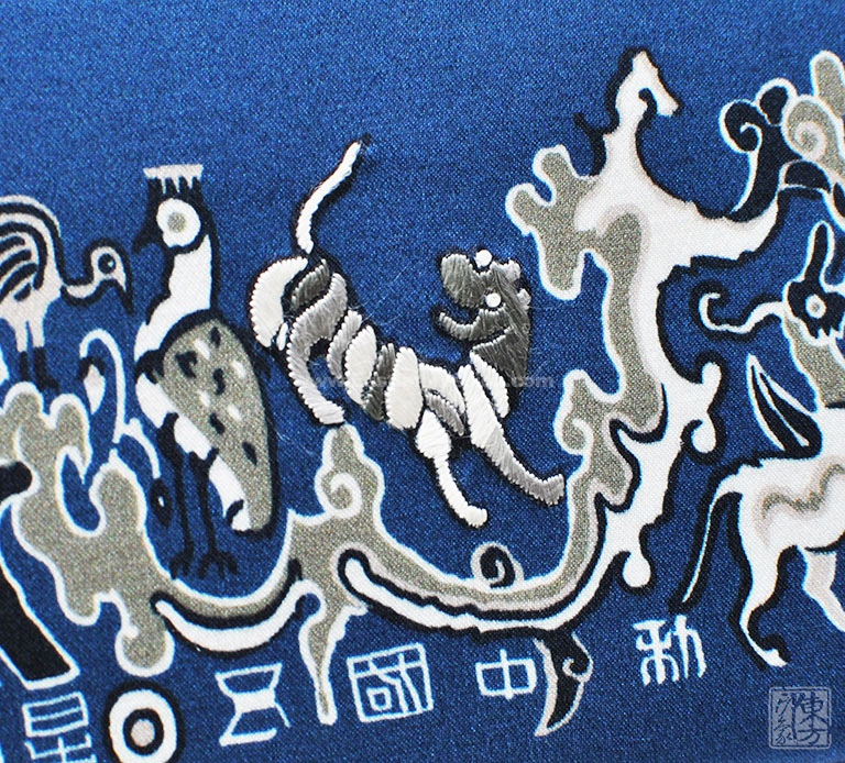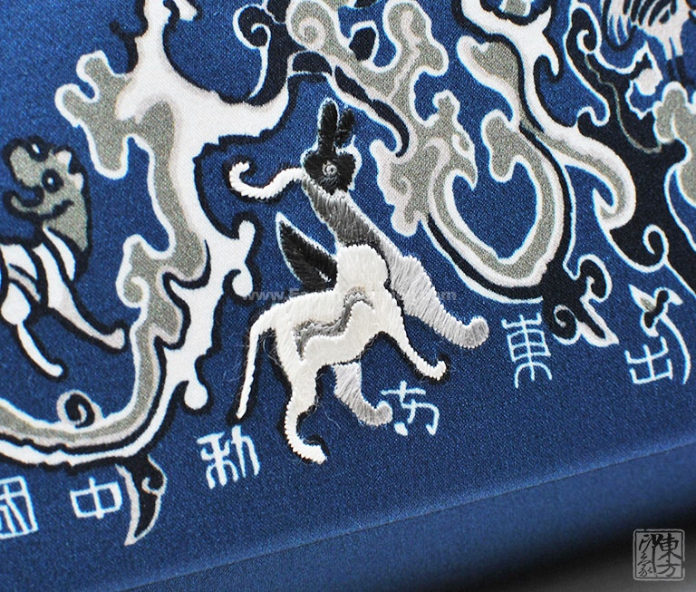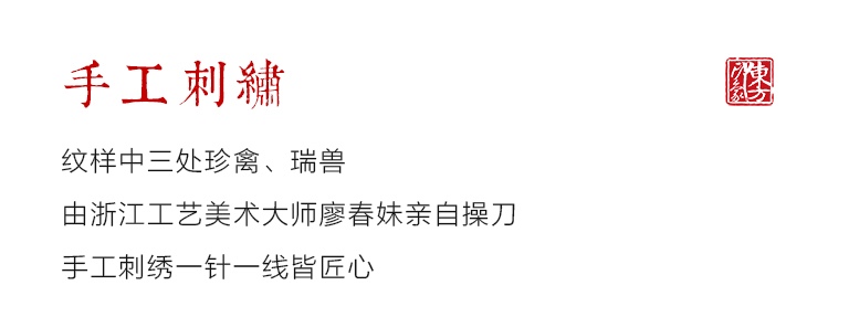 纹样中三处珍禽、瑞兽由浙江工艺美术大师廖春妹亲自操刀,手工刺绣一针一线皆匠心。