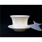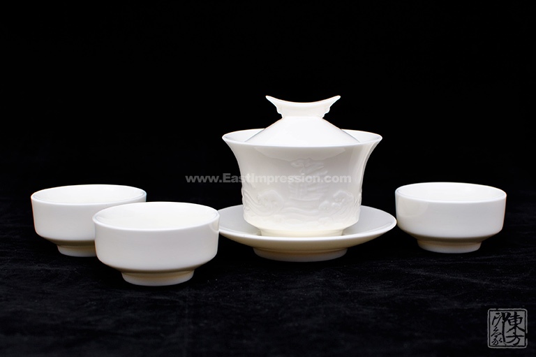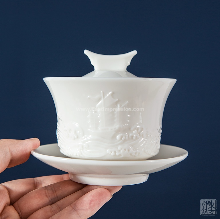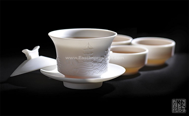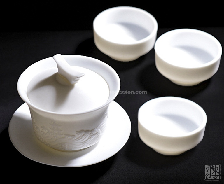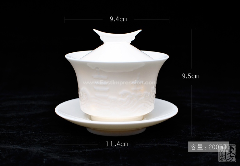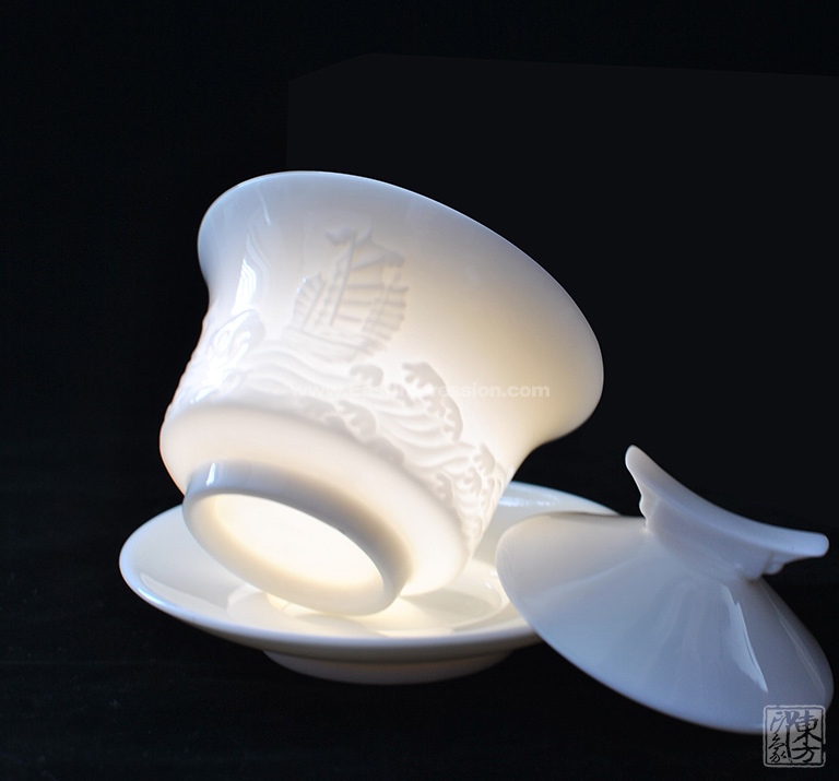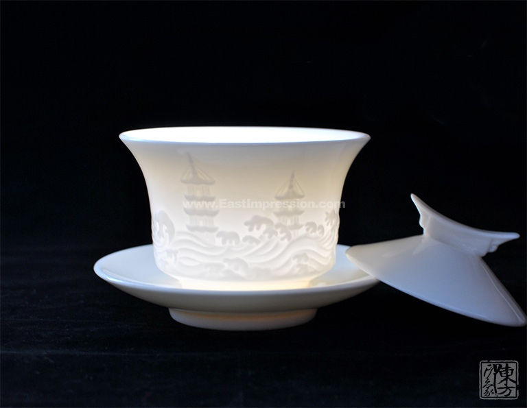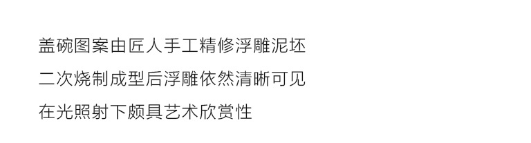 盖碗图案由匠人手工精修浮雕泥坯,二次烧制成型后浮雕依然清晰可见,在光照射下颇具艺术欣赏性。