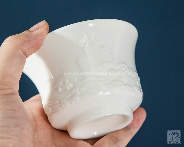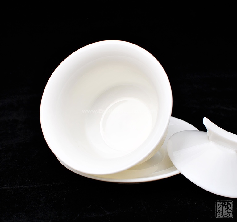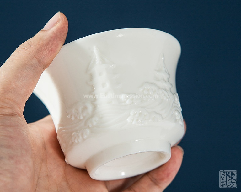 德化羊脂玉白瓷质地细腻,温润如凝脂,表面色泽白中泛米黄,十分柔和,更显茶汤澄亮。在光照射下,瓷体呈半透明猪油状,现乳白色泽。