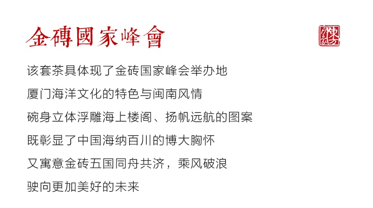 碗身立体浮雕海上楼阁、扬帆远航的图案,既彰显了中国海纳百川的博大胸怀,又寓意金砖五国同舟共济,乘风破浪,驶向更加美好的未来。