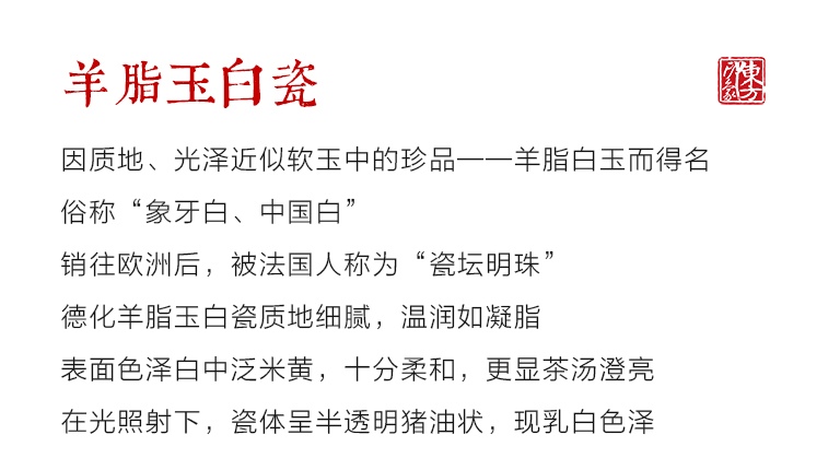 羊脂玉瓷—即德化窑白瓷,是中国白的最高档次白瓷,俗称“象牙白”,销往欧洲后,被法国人称为“瓷坛明珠”。