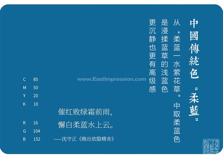 从“柔蓝一水萦花草”中取柔蓝色,是浸揉蓝草的浅蓝色,更沉静也更有高级感。