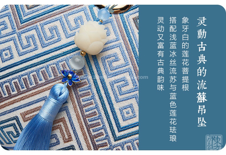 象牙白的莲花菩提根,搭配浅蓝色冰丝流苏与蓝色莲花珐琅,灵动又富有古典韵味。