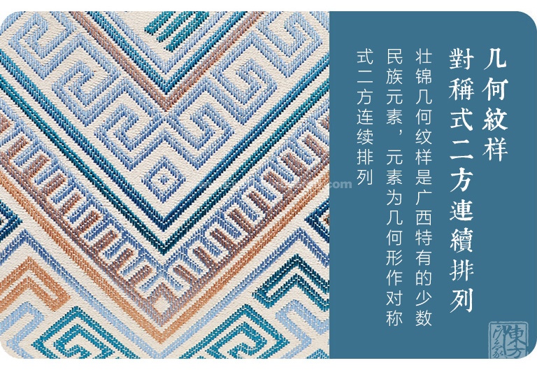 壮锦几何纹样是广西特有的少数民族元素,版型大气,元素多为方形、菱形、三角形等几何形作对称式二方连续排列,图案生动,结构严谨,极具少数民族特色。