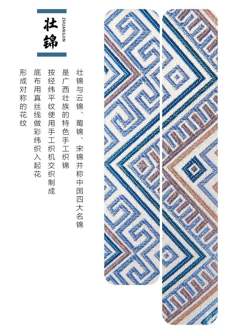 壮锦与云锦、蜀锦、宋锦并称中国四大名锦,是广西壮族的特色手工织锦,以棉线或麻线为主,按经纬平纹使用手工织机交织制成,底布用真丝线做彩纬织入起花,彩纬可以在底布的正反两面形成对称的花纹,并将底布完全覆盖。