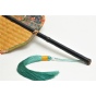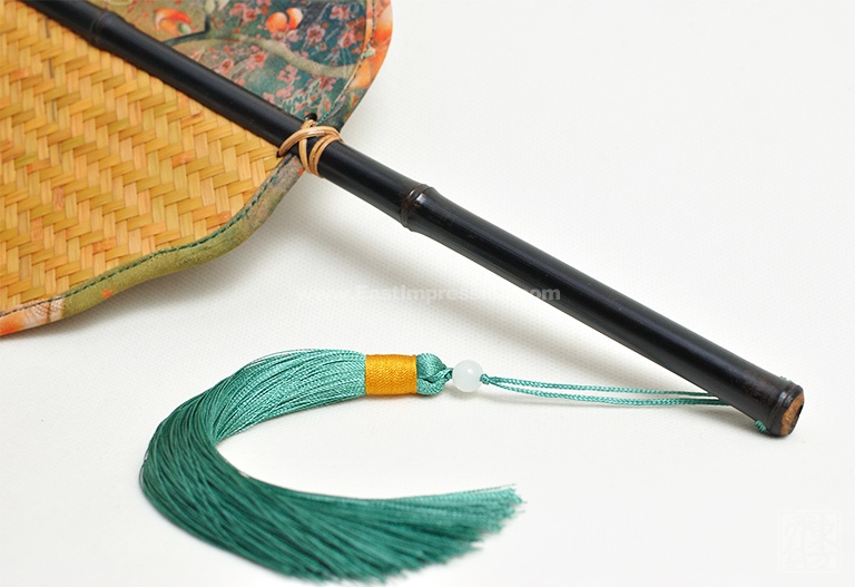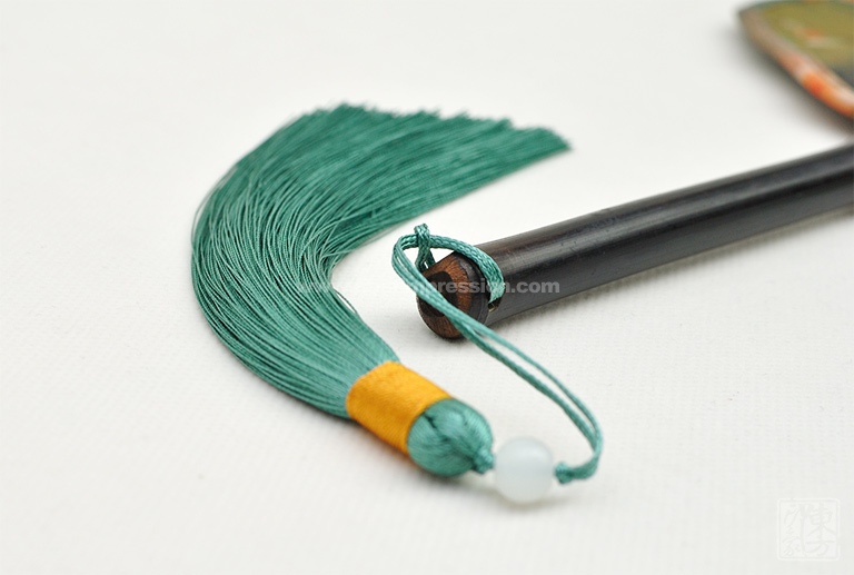 扇坠采用青绿色长流苏,搭配白色小串珠,精致美观。扇子轻摇,展现出别样的垂顺美感。