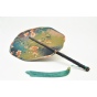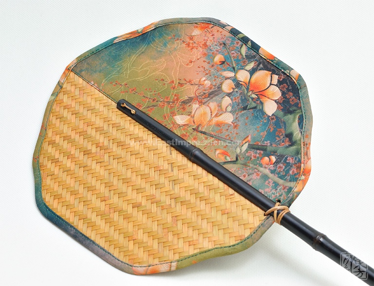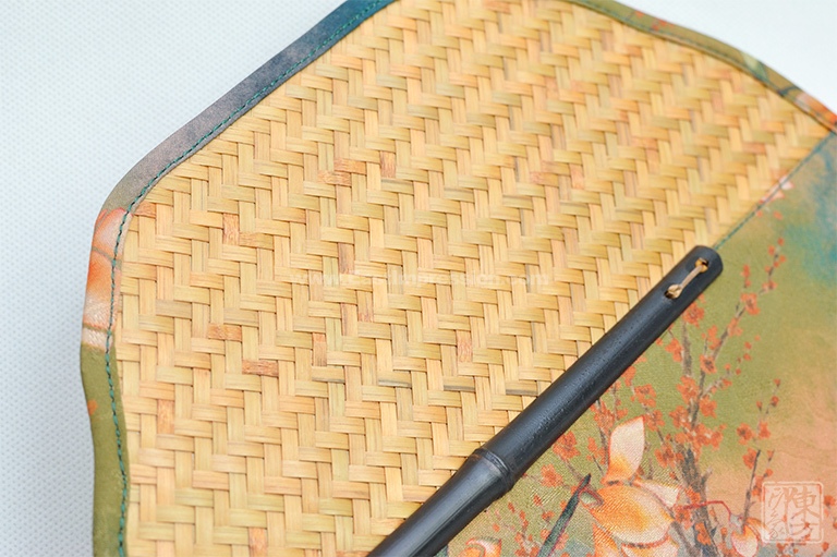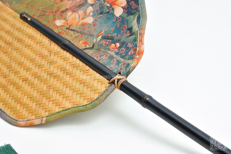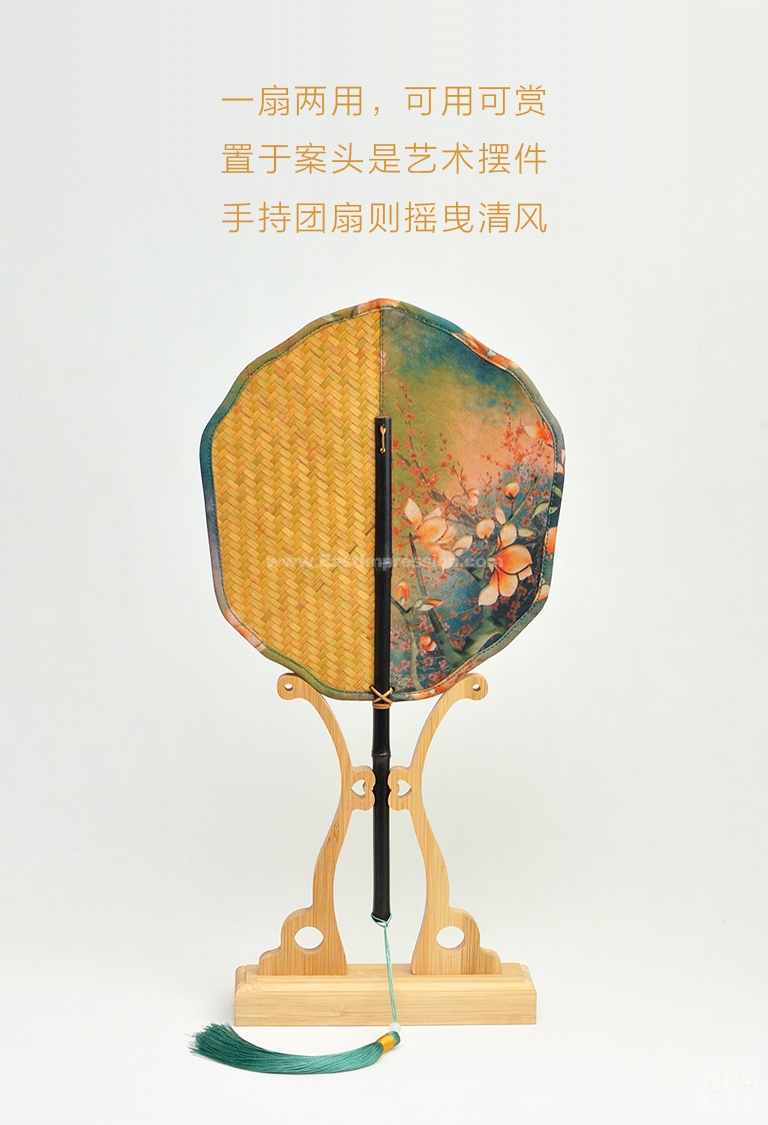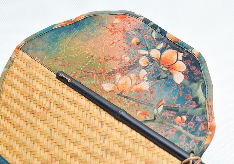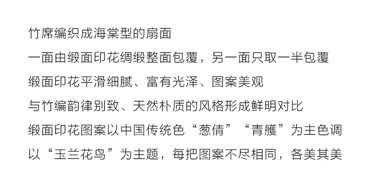 竹席编织成海棠型的扇面,一面由缎面印花绸缎整面包覆,另一面只取扇面的一半包覆。手工竹编席面的纹理具有韵律之美,天然朴质的风格与缎面印花平滑细腻、富有光泽、图案美观形成鲜明对比。