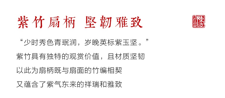 紫竹具有独特的观赏价值,竹杆紫黑色,柔和发亮,隐于绿叶之下,甚为绮丽,是中国传统的观竿竹类。紫竹材质坚韧,以此为扇柄既与扇面的竹编相契,又蕴含了紫气东来的祥瑞和君子雅致的风范。