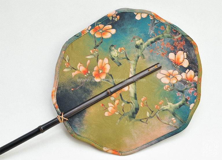 “新裂齐纨素,鲜洁如霜雪。裁为合欢扇,团团似明月。” 自西汉班婕妤写下一首《团扇诗》,东方的团扇,便开始有了自己的姓名,成为中国人最温柔含蓄的眷念。一轮明月形的扇子称之为“纨扇”或“团扇”,也叫“合欢扇”。它是中国汉族传统工艺品及艺术品,是一种圆形有柄的扇子,代表着团圆友善、吉祥如意。团扇起源于中国。扇子有长圆、葵花、梅花、六角、匾圆之形;亦有木、竹、骨等材之柄;还有扇坠、流苏、玉器之饰。扇面上常绣以山水花卉,款式争奇斗艳,闺阁仕女手摇团扇,清风徐来,不但可以平添主人娴雅文静的仪态,又能体现女性天真活泼的个性。