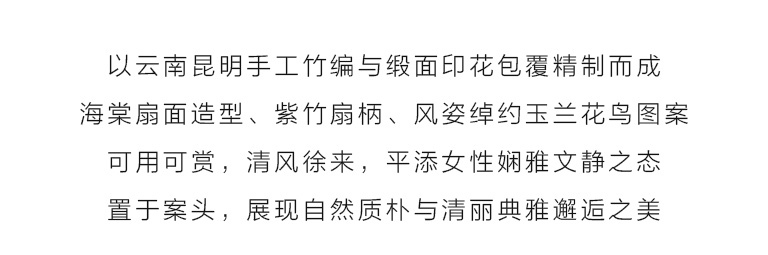 团扇以云南昆明手工竹编与缎面印花包覆精制而成,海棠扇面造型、紫竹扇柄、风姿绰约玉兰花鸟图案,可用可赏。清风徐来,平添女性娴雅文静之态;置于案头,展现自然质朴与清丽典雅邂逅之美。