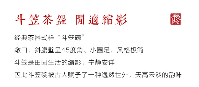 经典茶器式样“斗笠碗”,敞口、斜腹壁呈45度角、小圈足,风格极简。斗笠是田园生活的缩影,宁静安详,因此斗笠碗被古人赋予了一种逸然世外,天高云淡的韵味。