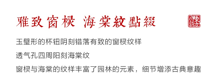玉璧形的杯钮阴刻错落有致的窗棂纹样,透气孔四周阳刻海棠纹。窗棂与海棠的纹样丰富了园林的元素,细节增添古典意趣。