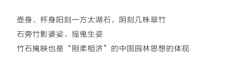 壶身、杯身阳刻一方太湖石,阴刻几株翠竹。太湖石是时间与自然共同雕琢的艺术品,石旁竹影婆娑,摇曳生姿,竹石掩映也是“刚柔相济”的造园思想的体现。