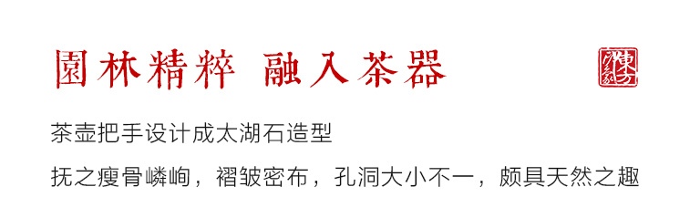 茶壶把手设计成太湖石造型,抚之瘦骨嶙峋,褶皱密布,孔洞大小不一,颇具天然之趣。