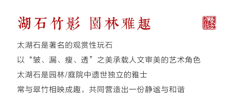 太湖石是著名的观赏性玩石,以“皱、漏、瘦、透”之美承载人文审美的艺术角色。太湖石是园林/庭院中遗世独立的雅士,常与翠竹相映成趣,共同营造出一份静谧与和谐。