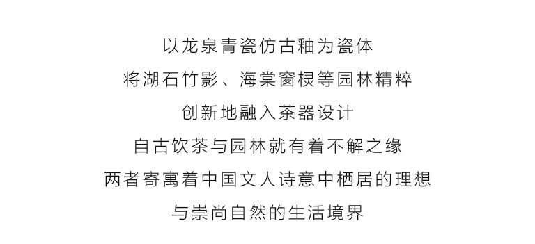 茶具以龙泉青瓷仿古釉为瓷体,将湖石竹影、海棠窗棂等园林精粹创新地融入茶器设计。自古饮茶与园林就有着不解之缘,所谓理想的庭院一定要有一处喝茶的地方,两者寄寓着中国文人诗意中栖居的理想与崇尚自然的生活境界。