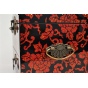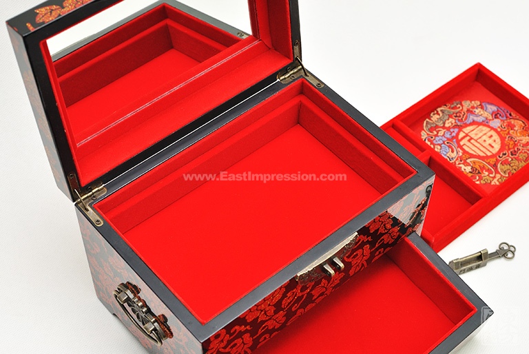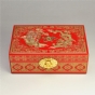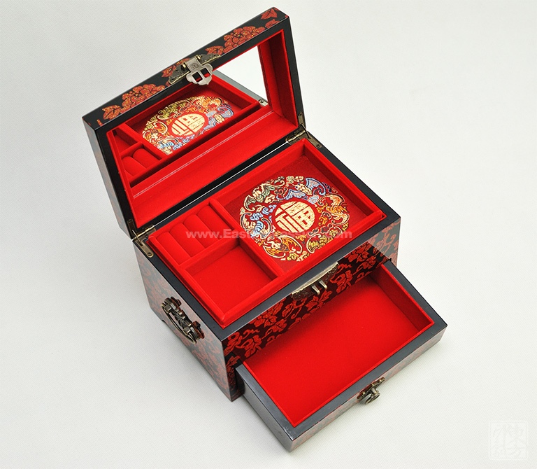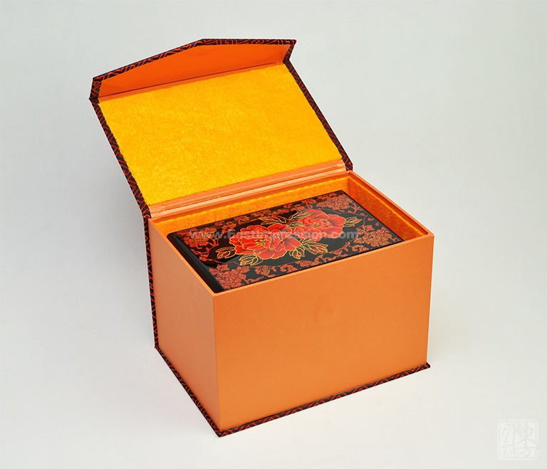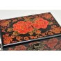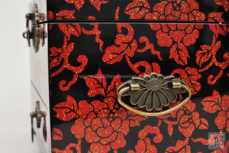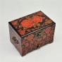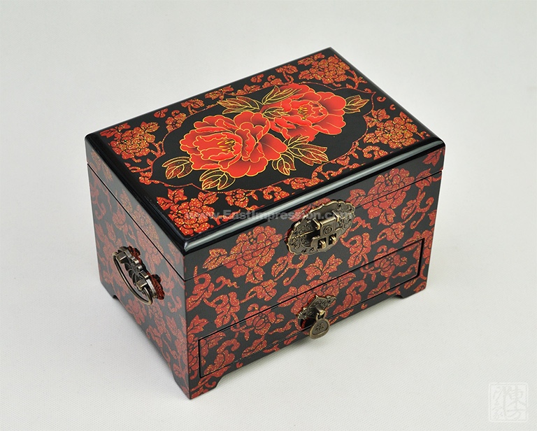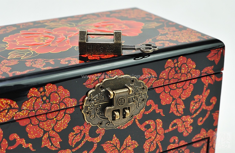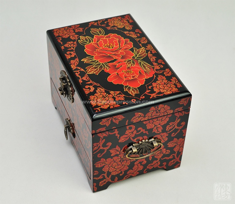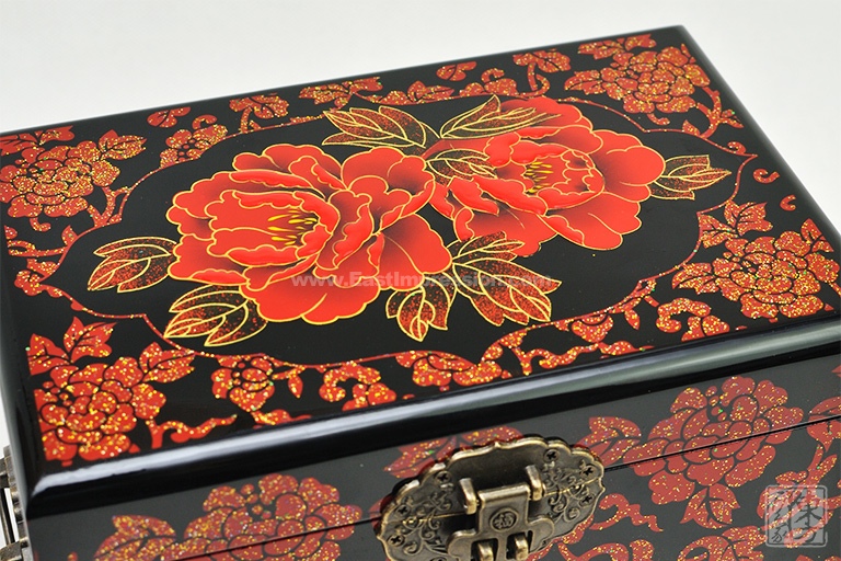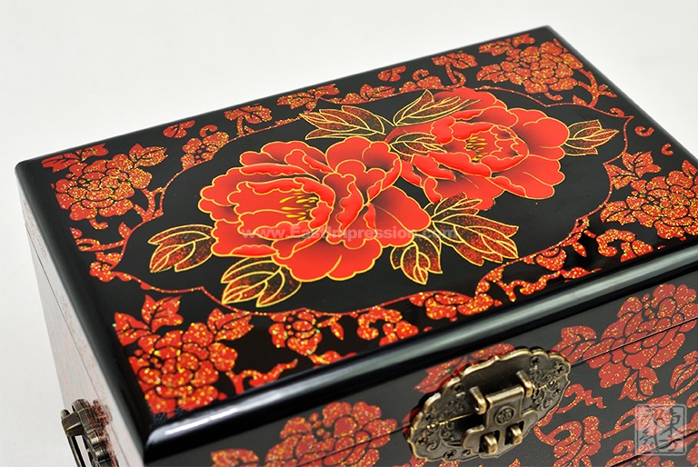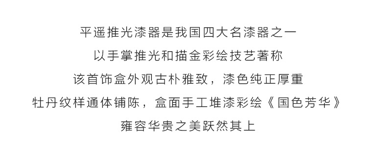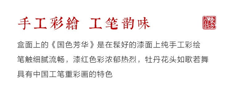 首饰盒面上的《国色芳华》在髹好的漆面上纯手工彩绘,笔触细腻流畅,漆红色彩浓郁热烈,牡丹花头如歌若舞,具有中国工笔重彩画的特色。