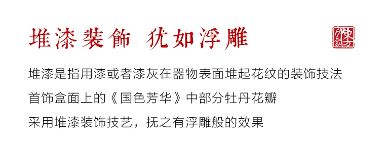 堆漆是指用漆或者漆灰在器物表面堆起花纹的装饰技法。首饰盒面上的《国色芳华》中,部分牡丹花瓣的翻转折叠采用高堆漆装饰技艺,抚之有浮雕般的效果。