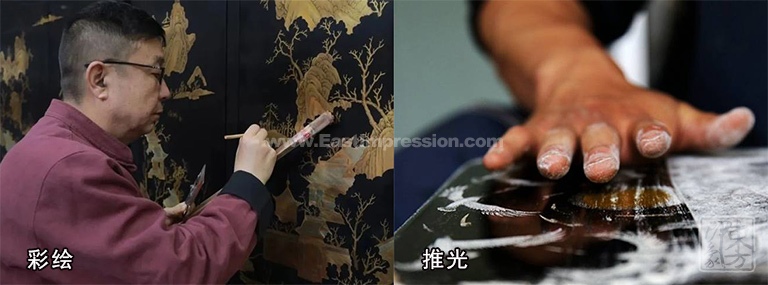 最后一道面漆工序,要用手掌推磨抛光出光,也就是推光漆的“推光”。先用细砂纸把漆面打磨光滑,接下来要用优质椴木烧制的木炭块细细蘸水打磨增加漆面的黑度,再用头发蘸油打磨,最后用手掌蘸上特制的细砖灰和麻油推光,推得漆面生辉,光洁照人。