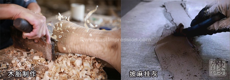 (3)木胎披麻挂灰,生漆灰须褙布,猪血灰须披麻,黄土胶则需褙纸;