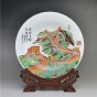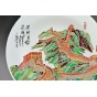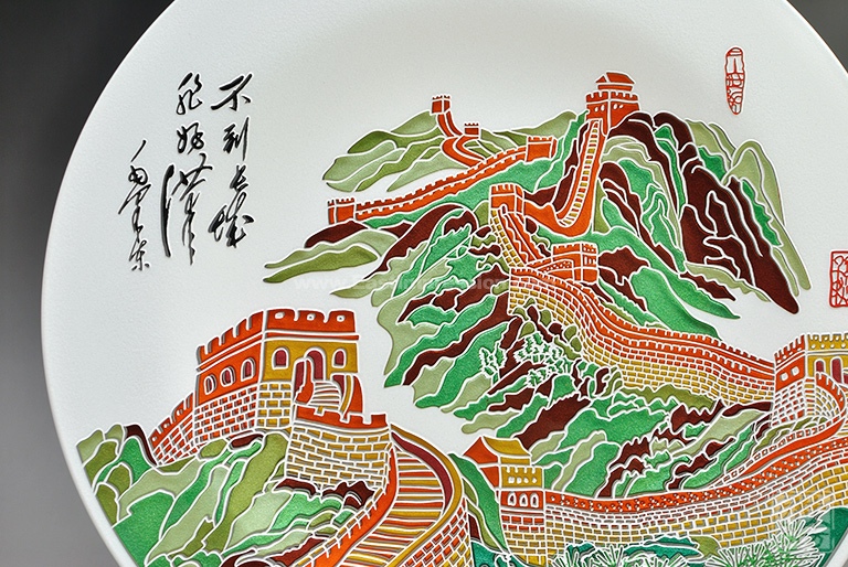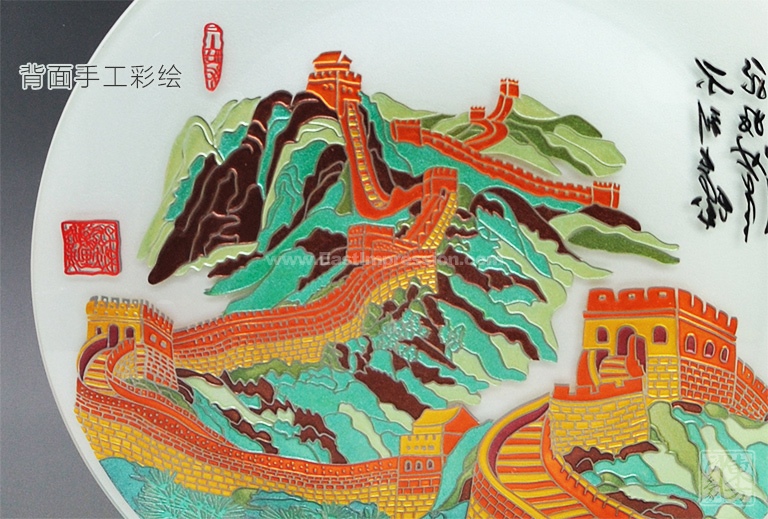 “巍巍长城”赏盘以纯正的珍珠白衬底,正面线描、填绘柔和的白色,反面块面手工填绘橙色、黄色、紫色展现敌楼、城墙、城砖、条石的风貌,满目苍翠的植被、青松则以不同明度的绿来呈现。崇山峻岭间巍巍长城蜿蜒如龙,以毛主席的名诗“不到长城非好汉”点题,更衬托出长城雄浑壮观的气势。