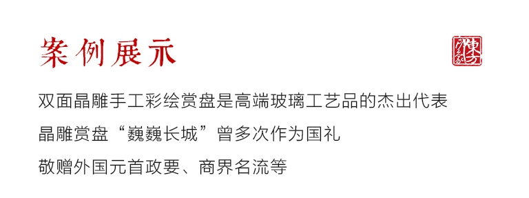 双面晶雕手工彩绘赏盘是国内外高端玻璃工艺品的杰出代表。近年来作为国礼多次随国家领导人出访,赠送外国元首、政要,还是外交部、公安部、首都机场等国家重要外交场所指定礼品。内蒙古自治区成立70周年大庆中央政府赠礼,香港回归20周年高端订制礼品,巴西里约奥运会官方礼品、北京冬奥会申办官方礼品等均选择了她。