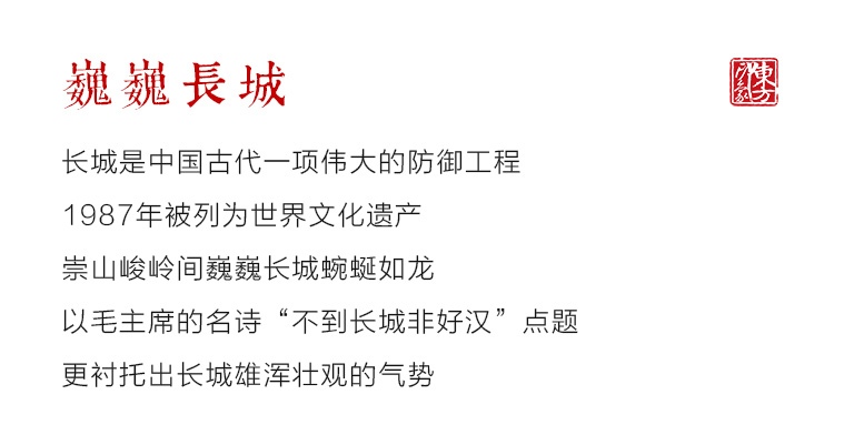 1987年12月,长城被列为世界文化遗产。古今中外,凡到过长城的人无不惊叹它的磅礴气势、宏伟规模和艰巨工程。