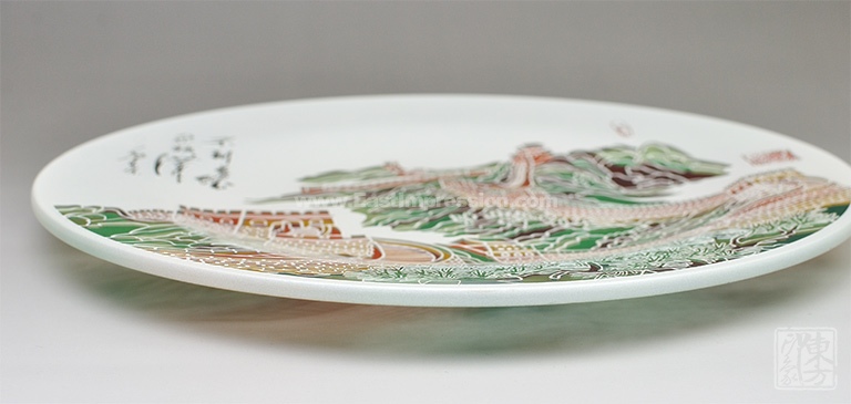 双面晶雕手工彩绘赏盘以从土耳其进口的高透高亮的水晶玻璃为材质,巧妙地利用了玻璃的透光性和折光性,在晶化玻璃盘的正反两面采用凹凸精细雕刻工艺进行雕刻,然后利用手工彩绘将水性釉料绘制在已雕刻好的图案上,再经数次高温烤制,具有环保健康、安全无毒、永不褪色的特点。