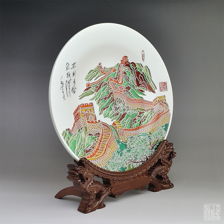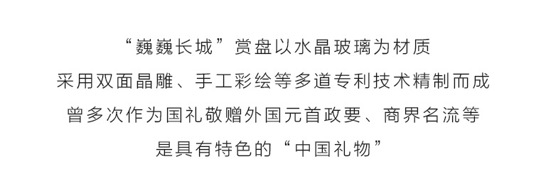 长城是中国古代一项伟大的防御工程,1987年被列为世界文化遗产。“巍巍长城”赏盘以水晶玻璃为材质,采用双面晶雕、手工彩绘等多道专利技术精制而成,配色纯净中显雅致,曾多次作为国礼敬赠外国元首政要、商界名流等,是具有特色的“中国礼物”。