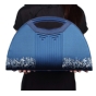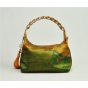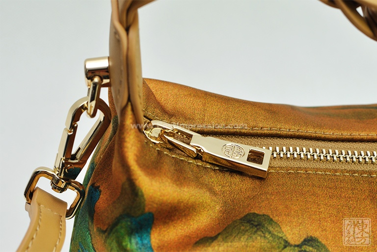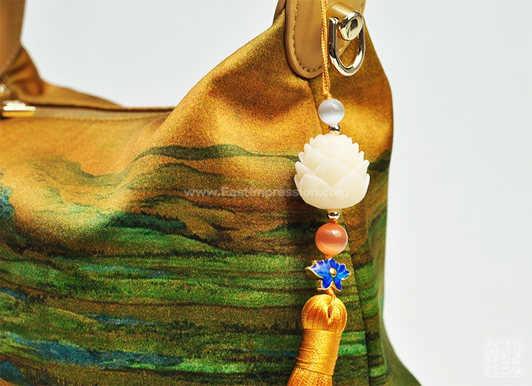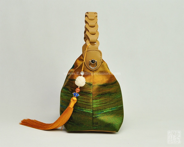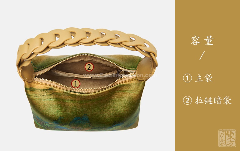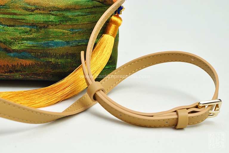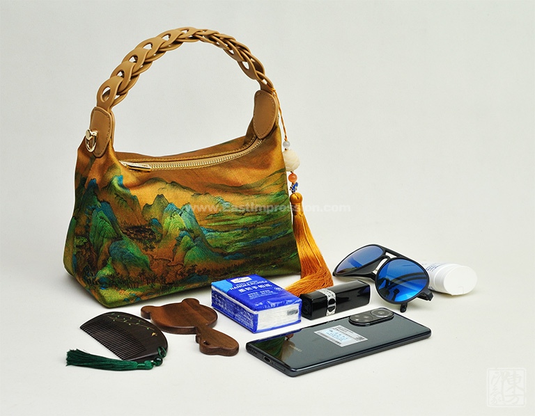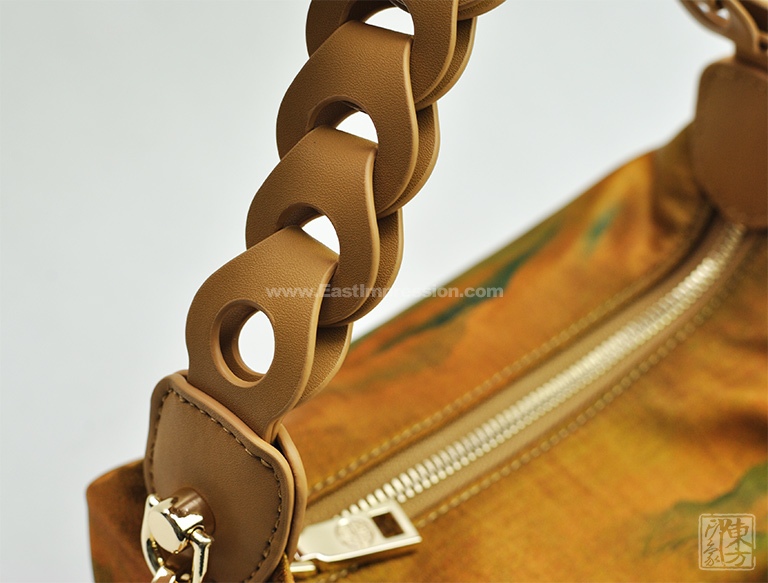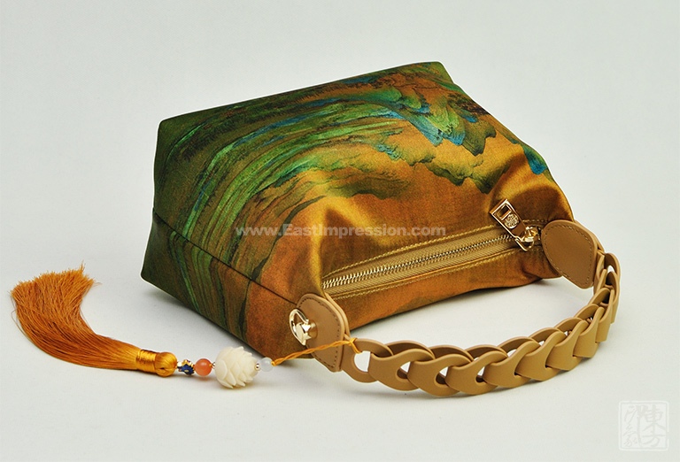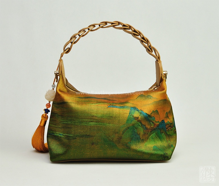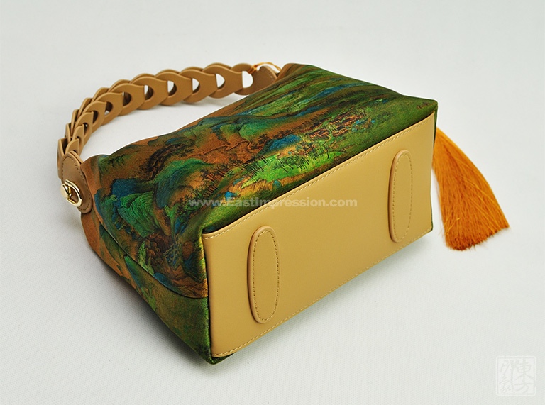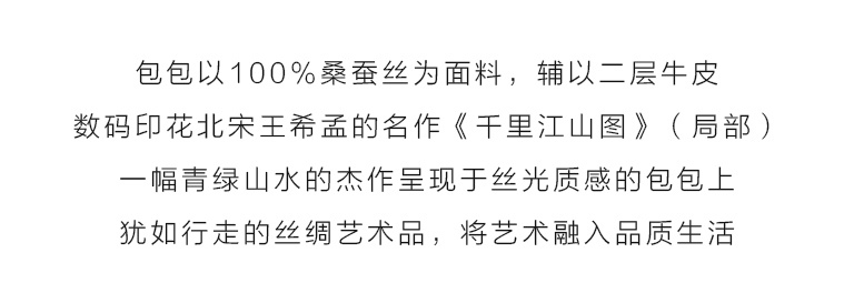 包包以100%桑蚕丝为面料,辅以二层牛皮,数码印花北宋王希孟的名作《千里江山图》(局部),一幅青绿山水的杰作呈现于丝光质感的包包上。犹如行走的丝绸艺术品,将艺术从庙堂之高融入品质生活。
