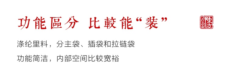 涤纶里料,主袋与拉链辅袋,功能简洁,内部空间较为宽裕。
