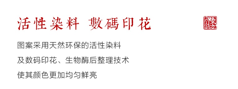 图案采用天然环保的活性染料及数码印花、生物酶后整理技术,使其颜色更加均匀鲜亮。