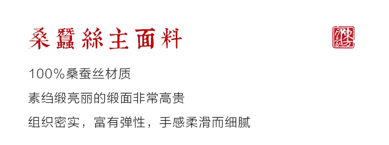 100%桑蚕丝材质,素绉缎亮丽的缎面非常高贵,组织密实,富有弹性,手感柔滑而细腻。