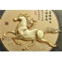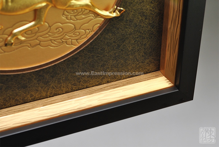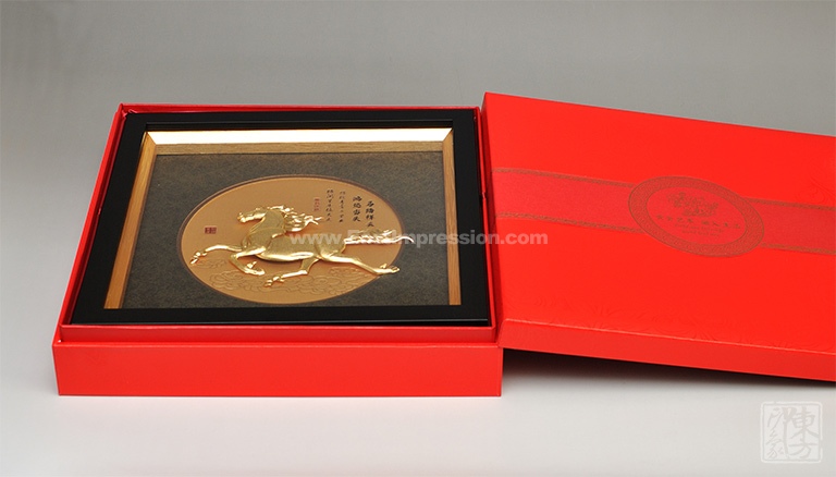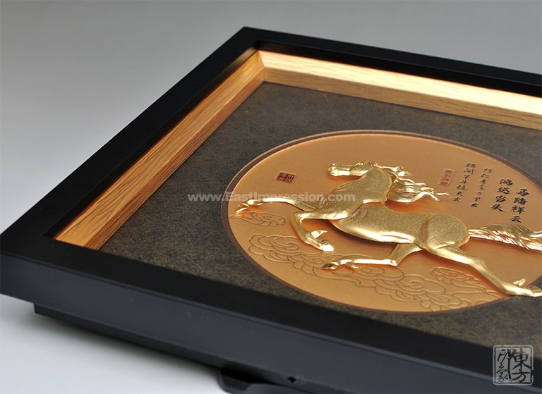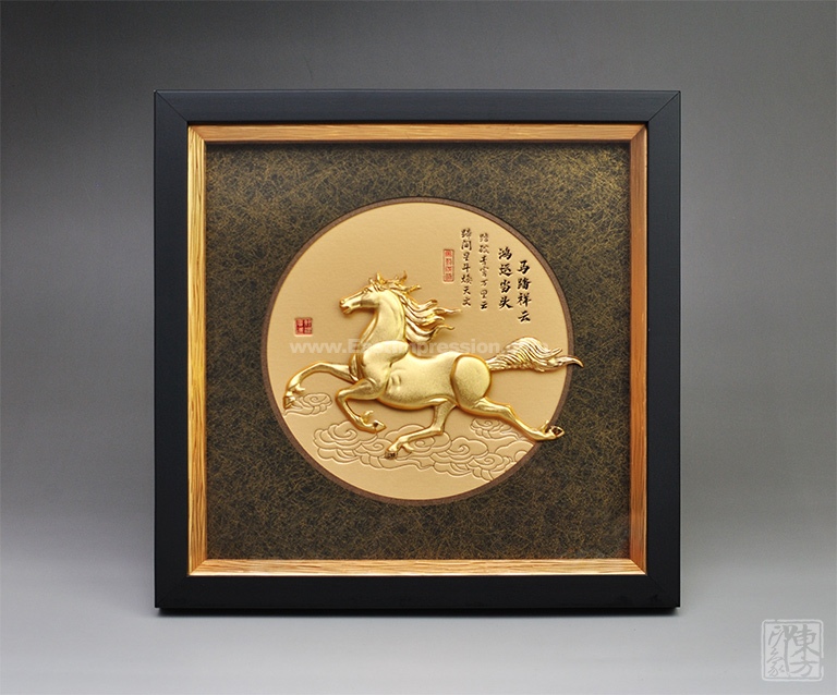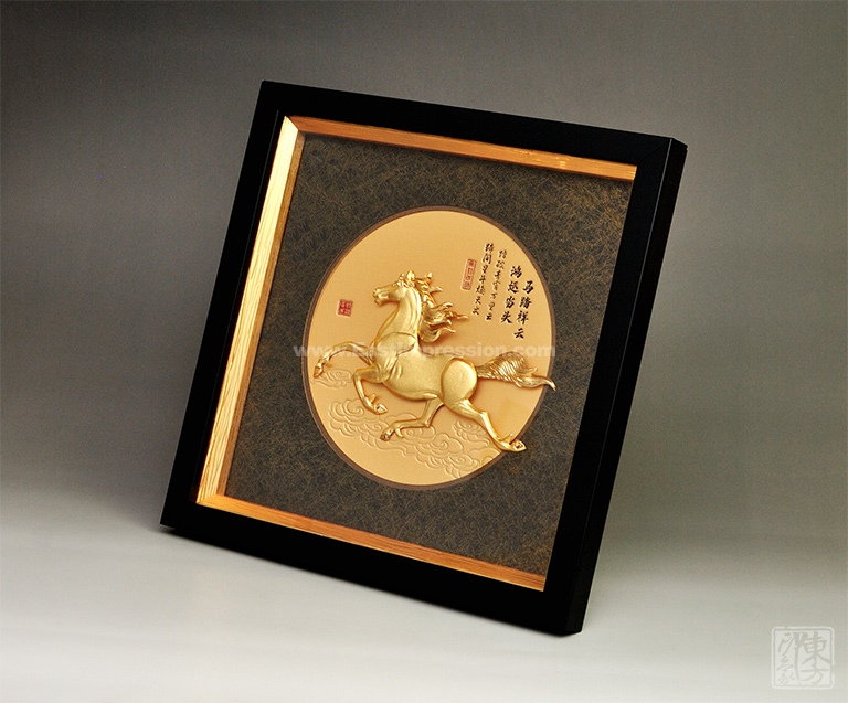 立体金箔画是将黄金的观赏价值发挥到淋漓尽致的工艺品。“马踏祥云”立体金箔画以高纯度金箔呈现奔马的主题形象。马踏祥云,鸿运当头,中华民族自古以来推崇龙马精神,马更是自由独立、勇往直前、马到成功的象征。