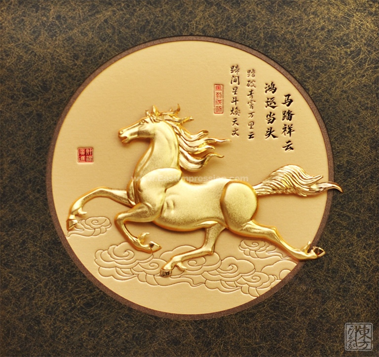 “马踏祥云”立体金箔形象以圆形“开窗”突出呈现,背景采用金色压纹纸,祥云纹、“马到成功”与“财源广进”印章均采用烫金工艺,以金衬金,愈加华丽高贵。