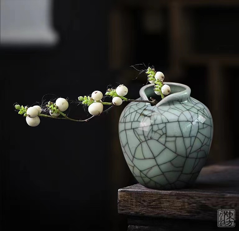 小花插取旗袍“立领、盘扣、斜门襟”的典型特征,犹如美人,风姿绰约。釉色灰青,釉面如冰似玉,具有龙泉青瓷哥窑“黑胎厚釉,紫口铁足,满布大小龟裂纹片”的典型特征。以此装点雅室生辉,展现了随性自然、沉静幽雅的东方美学风格。