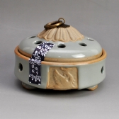 该款半陶龙泉釉檀香炉造型沉静,形似蒸笼,龙泉釉面晶莹饱满,釉色灰青。瓷的光洁细腻与陶的质朴粗犷浑然一体,淳朴自然的气息,似一缕檀香的馨香慢慢从香孔中浸出,使人的心境也随之平和起来。是敬神礼佛、禅坐、品茗、伴读及修行之佳品。