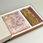 云锦是中国传统的华丽高贵的提花丝织工艺品,有近700年皇家御用历史,2009年入选《人类非物质文化遗产代表作名录》。其用料考究,织工精细,图案色彩典雅富丽,宛如天上的云彩般瑰丽。此款套装以桑蚕丝为经,五彩丝线为纬,交织而成。深红色唐诗书法领带与彩色系花卉围巾将男士潇洒旷达的气质与女士柔美多姿的风韵有机结合,是馈赠夫妻、情侣的上佳礼物。