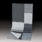 该款围巾以100%桑蚕丝为原料,面料为真丝拉绒。桑蚕丝是天然的动物蛋白质纤维,有“纤维皇后”的美誉。物理拉绒工艺的处理使得围巾佩戴起来柔软舒适、亲肤保暖。大小块面与不同明度的灰色交错呈现,犹如中国画中技法中的墨分五色、浓淡变化,佩戴在身充满知性、柔和、时尚的气息。