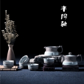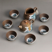 该青花陶釉套装是由一个茶壶、一个公道杯和六个茶杯组成。精选原矿陶土结合青花装饰手法精制而成。其造型圆润饱满,陶面温润细腻,瓷面莹润光洁,壶体杯面及小杯内底均以手绘饰以古代冬天生活场面和景致,浓浓的生活气息迎面而至。