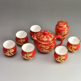 金镶玉是中国独有的传统手工艺品,曾多次作为国宾礼品礼赠外国元首及国际友人。该套茶具以福建德化高温红瓷为载体,以99.99%纯锡为镶料,经过数十道手工工艺精心制作而成。选取“祥龙逐日”等传统吉祥图案进行锡镶镀99.9%黄金,层面服贴平整,凹凸有致,呈现出浮雕般的艺术效果。整体风格喜庆吉祥、雍容华贵,是馈赠上品。